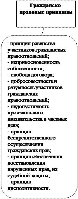Рисунок 1 – Принципы гражданского права Принцип равенства участников гражданских правоотношений – состоит в том, что все субъекты гражданского права участвуют в гражданских правоотношениях как лица равноправные. Ни один из них не может пользоваться преимуществами и привилегиями, противоречащими закону. Ни один из субъектов гражданского права, даже если им является Республика Беларусь или административно-территориальные единицы, вступая в правоотношения с другими субъектами, не может применить к нему властные функции, приказать ему [7, c. 31]. Все субъекты гражданского права должны соблюдать одни и те же нормы гражданского права. Принцип неприкосновенности собственности – означает, что собственность, приобретенная законным способом, защищается государством. Неприкосновенность собственности, право ее наследования охраняются законом, а принудительное отчуждение имущества допускается лишь по мотивам общественной необходимости. При этом должны соблюдаться условия и порядок, определенные законом, со своевременным и полным компенсированием стоимости отчужденного имущества, а также согласно постановлению суда. Статья 236 ГК содержит полный перечень оснований принудительного изъятия имущества у собственника. Действие этого принципа обеспечивает стабильность экономики страны. Принцип свободы договора – заключается в том, что в соответствии с этим принципом стороны сами решают вопрос, вступать или не вступать в договор, каковы должны быть условия договора, в какой вид договора целесообразно вступить. Понуждение к заключению договора не допускается, от кого бы оно не исходило, за исключением случаев, когда обязанность заключить договор предусмотрена законодательством или добровольно принятым на себя обязательством. В частности, коммерческая фирма не имеет права отказаться от заключения публичного договора по продаже товаров, выполнению работ или оказанию услуг с каждым, кто к ней обратится. Стороны могут заключить предварительный договор, в соответствии с которым обязаны в будущем заключить основной договор. Принцип добросовестности и разумности участников гражданских правоотношений – лицо, действующее недобросовестно, несет неблагоприятные для него последствия, предусмотренные соответствующими статьями ГК. В частности, у добросовестного приобретателя собственник вправе истребовать свое имущество только в случаях, когда оно выбыло из его владения помимо его воли, а у недобросовестного владельца – всегда. Принцип разумности используется при расторжении договоров присоединения, заключенных на явно обременительных для присоединившейся стороны условиях, изменении и расторжении договора в связи с существенным изменением обстоятельств, из которых стороны исходили при заключении договора, при определении сроков исполнения обязательств, когда они обязательством не предусмотрены и т.д. Принцип недопустимости произвольного вмешательства в частные дела – вытекает из статьи 28 Конституции Республики Беларусь, предусматривающей право каждого на защиту от незаконного вмешательства в его личную жизнь, в том числе от посягательств на тайну его корреспонденции, телефонных и иных сообщений, на его честь и достоинство. Никто, включая органы государственной власти, не вправе произвольно вмешиваться в частные 
