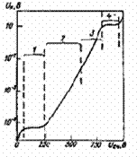Рис. 8. Зависимость амплитуды импульса от напряжения на счетчике (1 – область работы ионизационной камеры; 2 – пропорциональная область; 3 – область ограниченной пропорциональности; 4 – область Гейгера) Счетчик, работающий в описанном выше режиме, называется пропорциональным . Величина импульса, образующегося на нагрузочном сопротивлении такого счетчика, пропорциональна первичной ионизации, обусловленной прохождением через него ионизирующей частицы. В зависимости от газа-наполнителя коэффициент газового усиления А может изменяться в значительных пределах. Например, в пропорциональных счетчиках, наполненных инертными газами, величина коэффициента А составляет около 103 , а в случае наполнения аргоном с небольшой примесью многоатомных газов А может достигать 104 . При определенных условиях в рабочем объеме счетчика может возникнуть так называемый коронный разряд, не нуждающийся для своего поддержания в действии внешнего ионизатора и являющийся поэтому разновидностью самостоятельного разряда. Коронный разряд возникает при сравнительно больших давлениях газа-наполнителя, когда электрическое поле между электродами счетчика крайне неравномерно. В счетчике с коаксиальным расположением электродов эта неравномерность обусловливается малым радиусом кривизны нити анода. Корона у нити счетчика возникает в виде тонкого слоя светящегося газа. Этот слой называют коронирующим слоем. В нем идет усиленное образование электронных лавин. Остальное пространство в таком счетчике представляет внешнюю область короны, в которой нет свободных электронов, отсутствует ударная ионизация, и носителями тока являются в основном положительные ионы. При отсутствии облучения через счетчик протекает флуктуирующий темновой ток (ток короны). При прохождении ионизирующих частиц через коронирующий разрядный промежуток в счетчике возникают импульсы тока, пропорциональные величине первичной ионизации. Импульсы, снимаемые с нагрузочного сопротивления счетчика, могут быть зарегистрированы при прохождении через счетчик сильноионизирующих частиц, например, α-частиц или протонов. Импульсы, вызываемые слабоионизирующими частицами (β-частицами), имеют малую амплитуду, сливаются с фоном флуктуации тока короны и поэтому не могут быть зарегистрированы. При увеличении напряжения на электродах коронного счетчика он также работает вначале как ионизационная камера, а затем как пропорциональный счетчик. По достижении напряжения зажигания Uз называемого порогом короны, в счетчике вспыхивает коронный разряд. Ток, проходящий через счетчик, резко возрастает, достигая приблизительно 10-7 А. Этот ток имеет колебательный характер. Амплитуда и частота колебаний тока короны, а также его средняя величина возрастают с увеличением перенапряжения, т. е. превышением напряжения над порогом короны. При попадании в объем счетчика сильноионизирующей частицы, производящей значительную дополнительную ионизацию, ток в счетчике сильно возрастает, превышая амплитуду колебаний тока короны в 10-20 раз. Многие типы счетчиков могут регистрировать несколько различных видов излучений. α-частицы регистрируют торцевыми пропорциональными и коронными счетчиками, а также проточными счетчиками. Окна торцевых счетчиков изготовляют из слюдяных или алюминиевых пластинок. 2.2. Ме