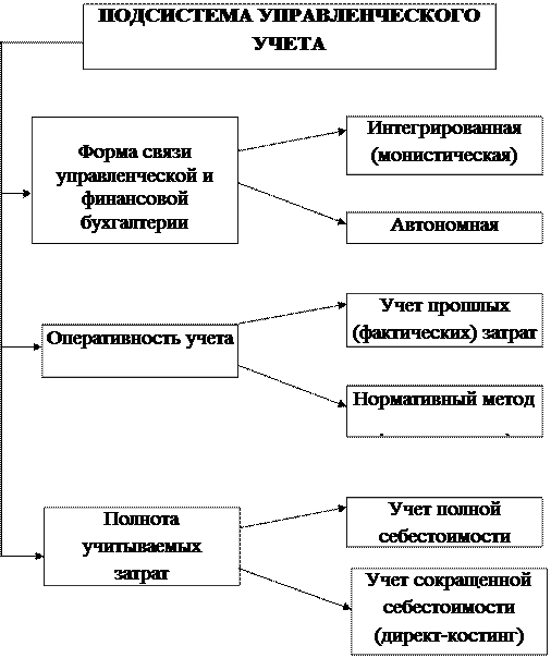 А – производственный учет Б – финансовый учет для внутреннего пользования В – финансовый учет в узком смысле для внешних пользователей Г – налоговые расчеты на базе финансового учета (налоговый учет). Выделяют два подхода к пониманию сущности термина «управленческий учет»: первый связан с managementaccounting, второй – с европейским «контроллинг» (Германия). В соответствии с первым термином основной задачей любой учетной деятельности является обеспечение управленческого персонала предприятия своевременной и полной информацией для принятия управленческих решений. Это означает, что деятельность по учету неразрывно связана с управлением предприятием в целом и отдельными его частями. Поэтому managementaccounting может быть переведен как организация учета, исходя из потребностей управления. При таком подходе управленческий учет – не только система сбора и анализа информации об издержках предприятия, но и система бюджетирования, система оценки деятельности подразделений. В целом, это в большей степени управленческие, чем бухгалтерские технологии. В соответствии со вторым понятием управленческий учет рассматривается как система сбора и интерпретации информации о затратах, издержках и себестоимости продукции, т.е. это расширенная система организации учета для целей контроля за деятельностью предприятия. В узком смысле под управленческим учетом можно понимать учет и контроль затрат и доходов, связанных с деятельностью предприятия. В российской практике чаще управленческий учет рассматривается в широком смысле (в соответствии с термином managementaccounting) как система, которая в рамках одной организации обеспечивает управленческий персонал информацией, используемой для планирования, управления и контроля за деятельностью организации. [7] Предметом управленческого учета является производственная деятельность организации в целом и его отдельных структурных подразделений. Объектами управленческого учета являются издержки предприятия и его отдельных структурных подразделений – центров ответственности; результаты хозяйственной деятельности всего предприятия и центров ответственности; внутреннее ценообразование; бюджетирование и внутренняя отчетность. Различные сочетания экономических, юридических, организационных и технико-технологических факторов определяют разнообразие форм организации управленческого учета.