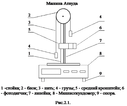 Схема экспериментальной установки на основе машины Атвуда приведена на рис.2.1. На вертикальной стойке 1 крепится легкий блок 2, через который перекинута нить 3 с грузами 4 одинаковой массы. В верхней части стойки расположен электромагнит, который может удерживать блок, не давая ему вращаться. На среднем кронштейне 5 закреплен фотодатчик 6. На корпусе среднего кронштейна имеется риска, совпадающая с оптической осью фотодатчика. Средний кронштейн имеет возможность свободного перемещения и фиксации на вертикальной стойке. На вертикальной стойке укреплена миллиметровая линейка 7, по которой определяют начальное и конечное положения грузов. Начальное положение определяют по нижнему срезу груза, а конечное - по риске на корпусе среднего кронштейна. Миллисекундомер 8 представляет собой прибор с цифровой индикацией времени. Регулировочные опоры 9 используют для регулировки положения экспериментальной установки на лабораторном столе. Принцип работы машины Атвуда заключается в том, что когда на концах нити висят грузы одинаковой массы, то система находится в положении безразличного равновесия. Если на правый груз положить перегрузок, то система грузов выйдет из состояния равновесия и начнет двигаться. 3. ОСНОВНЫЕ РАСЧЕТНЫЕ ФОРМУЛЫ Стандартная абсолютная погрешность измерения времени опускания груза с пригрузком: