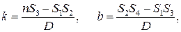 где: Определение параметров прямой линии k и b методомнаименьшихквадратовпроводиться по следующим формулам: