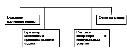 Рис. 2. Структура бухгалтерии Администрации Южного округа г.Оренбурга. Служебные обязанности работников бухгалтерии: Счетовод кассир получает в госбанке зарплату и выдает работникам предприятия. Принимает от населения плату за коммунальные услуги и сдает выручку в госбанк. Обрабатывает путевые листы. Выписывает организациям счета по авто услугам. В конце месяца делает кассовый отсчет. Бухгалтер расчетного отдела принимает наряды, табеля, больничные листы, производит по ним начисления, составляет платежную ведомость, ведет учет по счетам 68(подоходный налог), 76(расчеты с разными дебиторами и кредиторами), 60(расчеты с поставщиками и подрядчиками), 71(расчет с подотчетными лицами). Составляет отчет в фонд социального страхования. Бухгалтер материально-производственного отдела принимает и разрабатывает отчеты по складам и по службам. Ведет журнал ордер № 6(по выполненным работам и условиям) и журнал ордер № 5(затраты на производство). Ведет налоговый учет и составляет декларации, сдает в налоговую инспекцию. Счетчики, контролеры по коммунальным услугам ведут расчеты с населением по коммунальным услугам, составляет договора с населением и организациями на отпуск коммунальных услуг. Ежемесячно выписывают счета организациям. Контролируют самовольную врезку к тепловым и водопроводным сетям и предъявляют соответствующую плату. Главный бухгалтер обязан организовать документооборот на предприятии с использованием механизации и вычислительной техники. Обязан вести контроль за работу каждого отдела бухгалтерии т.е. за своевременностью учета поступления материальных ценностей, правильностью учета труда каждого работника бухгалтерии и начисление зарплаты, правильность учета, издержек производства и выпуска готовой продукции. Контроль за правильным расходованием денежных средств, определение финансовых результатов за хозяйственной деятельностью предприятия и расчетов с госбюджетом обязан своевременно предоставлять отчетность в выше стоящие организации. Если у главного бухгалтера и руководителя предприятия возникают разногласия по поводу использования денежных ресурсов или финансовых расчетов, то этот конфликт разрешается вышестоящим руководством организации. Главный бухгалтер имеет право распоряжаться денежными и финансовыми ресурсами предприятия, поэтому все денежные документы на поступление денег, на выдачу денег и на перечисление средств без подписи главного бухгалтера недействительно. Главный бухгалтер распределяет служебные обязанности между работниками бухгалтерии, устанавливает должностные оклады, сумму премии. Имеет право наказывать в административном порядке или лишать премиальных работников бухгалтерии за нарушение финансовой дисциплины или не выполнении своих обязанностей. Имеет право требовать предоставление форм отчетности со служб, подчиняемых бухгалтерии. Заключение По результатам наблюдений за работой организации и сотрудниками отдела можно сделать вывод, что сотрудники ответственные, а в коллективе преобладают взаимопонимание, сплоченность и взаимоуважение. Во время практики были изучены общие сведения об организации, исследованы и проанализированы доступные документы, рассмотрена профессионально-квалификационная структура персонала предприятия и система управления п