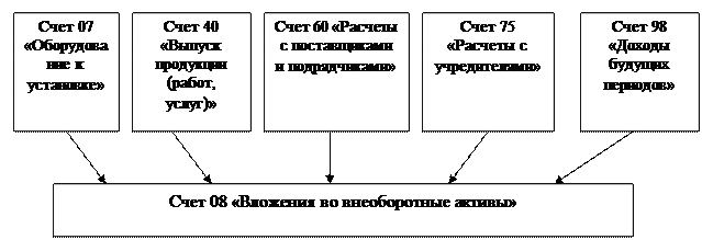 Рис. 4.1 Формирование вложений во внеоборотные активы В общем виде формирование капитальных затрат на счете 08 «Вложения во внеоборотные активы» отражается по дебету данного счета в корреспонденции со счетами: 07 «Оборудование к установке» - на балансовую стоимость оборудования, переданного для монтажа и установки; 40 «Выпуск продукции (работ, услуг)» - на сумму затрат в строительство объектов, монтаж оборудования, в создание иных объектов внутри организации, другие собственными силами выполняемые работы по созданию вне оборотных активов. Данные затраты могут также отражаться по кредиту счетов: 20 «Основное производство», 23 «Вспомогательные производства», 26 «Общехозяйственные расходы», минуя счет 40 «Выпуск продукции (работ, услуг)». 60 «Расчеты с поставщиками и подрядчиками» на сумму затрат на приобретение, создание (строительство) объектов внеоборотных активов, полученных со стороны, выполненных по договорам подряда. Такие затраты возникают как обязательства перед поставщиками и подрядчиками; 75 «Расчеты с учредителями» - на стоимость объектов внеоборотных активов, приобретаемых в качестве вклада в уставный капитал; 98 «Доходы будущих периодов» - на рыночную или иным установленным способом рассчитанную стоимость объектов внеоборотных активов, полученных организацией безвозмездно и в качестве дара (по договору дарения). На рисунке 4.2 представлена схема принятия к учету объектов внеоборотных активов.