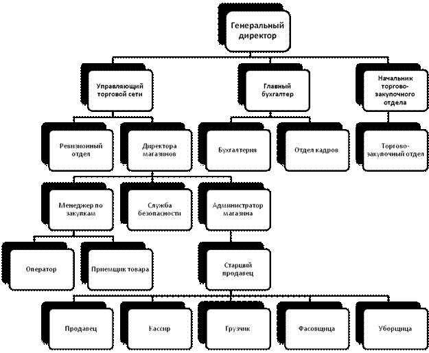 Рис. 5 Организационная структура ООО «Макаров и Компания» Поставщики обеспечивают поступление необходимых для осуществления деятельности организации видов ресурсов. В рассматриваемом нами случае ресурсами являются продукты питания, а также сопутствующие товары, которые во всех магазинах сети распределены на следующие группы: – мясопродукты не готовые к употреблению (01); – мясопродукты готовые к употреблению (02); – замороженные полуфабрикаты (03); – рыба и рыбная гастрономия (04); – молочная продукция (05); – масложировая продукция (06); – хлебобулочные изделия (07); – кондитерские изделия мучные (08); – кондитерские изделия сахаристые (09); – безалкогольные напитки (10); – вино-водочная продукция (11); – табак (12); – консервы (13); – приправы, пряности пищевые (14); – бакалея (15); – чай, кофе (16); – фрукты и овощи (17); – продукты для детского питания (18); – салаты (19); – сопутствующие товары (20); – материалы, запчасти (21); – продукция мясоперерабатывающего комбината (22); – цветы (23); – товары для животных (24); – снэки (25); – прочие товары (26).