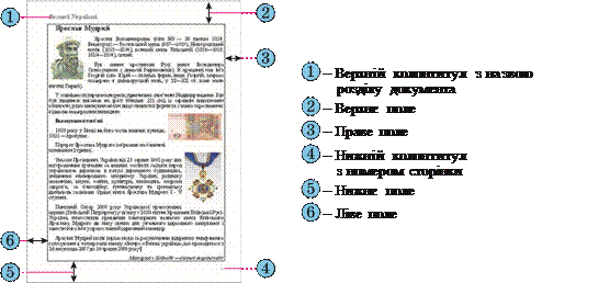 Рис. 1.1. Схема розміщення об’єктів сторінки Поля – це області сторінки вздовж її країв. На сторінці є верхнє , нижнє , ліве і праве поля. Розміри полів за замовчуванням задаються в сантиметрах. Ліве і праве поля частіше залишаються незаповненими, а на верхньому і нижньому полях можуть розміщуватися колонтитули .