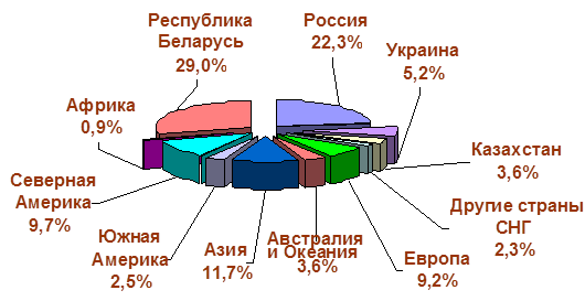 Рис. 2.2 Структура продаж ОАО "Белшина" по регионам мира за 2007год ОАО «Белшина»экспортирует свою продукцию в 53 страны мира. В их число входят все страны СНГ, а также страны Европы, Азии, Америки и Африки, Австралия. Крупнейшим внешнеторговым партнером организации является Россия, на долю которой приходится почти третья часть экспорта ОАО «Белшина». Из других стран СНГ наибольший объем экспортных продаж осуществлялся в Украину и Казахстан, удельный вес которых в общем объеме экспорта составил 7,3% и 5,1% соответственно. За 2007 год на экспорт было отгружено 2547,5 тыс. шин на сумму 418,3 млн. долл., что составляет 71 % общей выручки от реализации продукции общества за этот период. Объемы экспортных поставок за 2007 год возросли в 2,4 раза по сравнению с 2006 годом. В связи с дефицитом сверхкрупногабаритных шин наблюдался резкий спрос на шины данной группы. Основные потребители шин для карьерной техники – США, Латинская Америка, Страны Юго-Восточной Азии.
