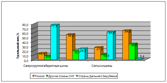 Рис. 2.3 Доля продаж ОАО "Белшина" по рынкам сбыта за 2007 год Товарная структура экспорта ОАО «Белшина» за 2007 год характеризуется следующими данными: Более половины объема экспортных продаж (58%) занимают сверхкрупногабаритные шины для карьерной техники. Сложившаяся в 2006 году благоприятная для общества конъюнктура внешнего рынка шин для автомобилей особо большой грузоподъемности позволила увеличить их продажу в 2007 году. Значительные объемы поставок сверхкрупногабаритных шин продолжали осуществляться в Индонезию, Австралию, Сингапур, США. Продажа на внешнем рынке шин для грузовых автомобилей и автобусов за 2007 год принесла ОАО «Белшина» 108,2 млн. долл., что составило 26% выручки от реализации продукции на экспорт. Более половины этих шин реализовано в Российскую Федерацию (56,3%). В объеме экспортных продаж данной группы шин 5% занимает продажа грузовых цельнометаллокордных шин, пользующихся повышенным спросом на рынке. В настоящее время на ОАО «Белшина» производится выпуск пяти типоразмеров цельнометаллокордных шин с посадочным диаметром 22,5 дюймов и один размер с диаметром 17,5 дюймов. Третье место по объему экспортных продаж за 2007 год занимает группа шин для легковых автомобилей, легких грузовиков и мини-автобусов. За счет их продажи на внешнем рынке получено 49 млн. долл. Их удельный вес в объеме экспорта составил 11,7 %. Россиия продолжает оставаться основным рынком сбыта легковых шин. Здесь их было реализовано 1415,8 тыс.шт. на сумму 30,5 млн. долл., что составляет 62,3 % экспортных продаж шин этой группы. Данные по удельному весу экспортных продаж различных групп шин за 2007 год представлены на рисунке 2.4