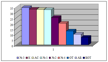 F кр. факторы. = 0.7; F кр. блоки = 2.8. Из результатов дисперсионного анализа по времени жизни спермиев после дефростации видно, что между протекторами нет значимых различий при значимости последних между блоками, т.е. все протекторы «работают» одинаково. По полученным коэффициентам регрессии Ti по обоим видам оценки качества биологических проб были составлены ранжированные ряды (рис. 5, 6).