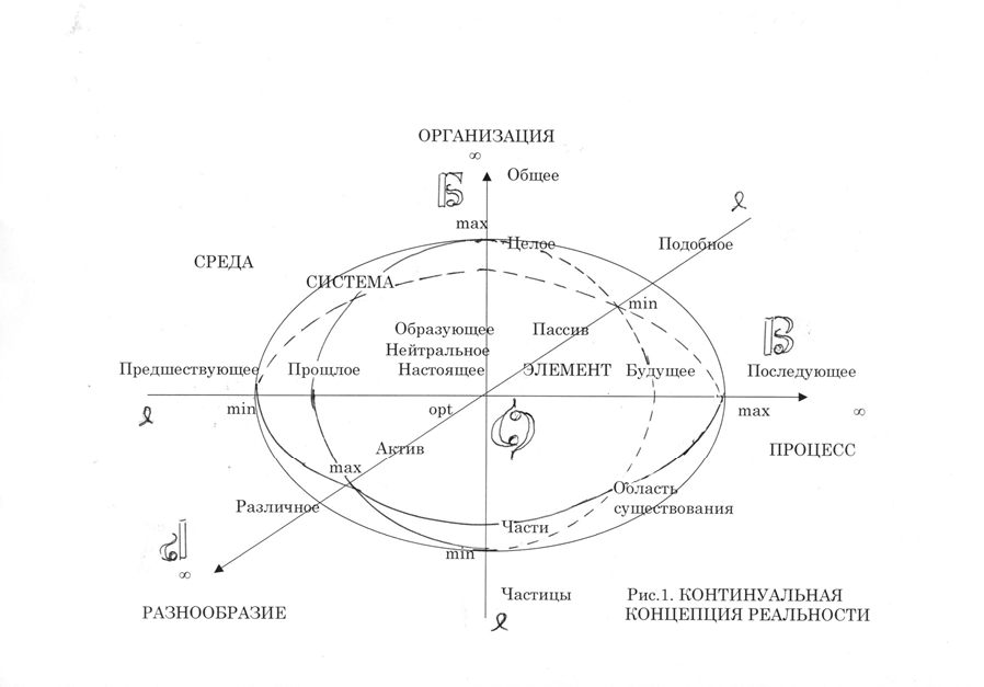 Наиболее осмысленным проявление Порядка Природы является изменение , воспринимаемое многими органами чувств, особенно наглядное, запоминающееся, интуитивно ощущаемое проявление реальности. Со времен Др. Греции известен постулат «все течет, все изменяется», когда это всеобщее проявление природы понималось линейно как процесс во времени, что в последствии философия расширила это представление до движения материальных объектов в пространстве и в настоящее время все чаще осмысливается как изменение вообще любых характеристик рассматриваемого явления во времени. Для теоретики необходимо сформулировать как принцип существования природы: «В природе всё изменяется направленно». Вербально это описывается более подробно как: всеобщее изменение в природе направлено во времени из бесконечно далекого прошлого в будущее, все существующее реальное происходит от предшествующего и порождает последующее, и каждое конкретное определенное зарождается в прошлом, проходит определенный срок существования и завершается в будущем. Параметрически идеальные единицы измерения различных изменений целесообразно отразить отдельными знаками: T - общая абсолютная длительность изменения, t - конкретный срок определенного дискретного процесса, (эпохи, этапа, стадии, ритма), τ - частные позиции изменяемого относительно общего времени явления: дата (воспринимаемые как миг, момент, мгновение). Количественно размеры изменений во времени можно задать через основные количественные оценки: Ω - бесконечно малая величина (смысловая нагрузка - «узелок»); Min - минимально допустимое значение, Opt - наиболее благоприятное значение, Max - максимально допустимое значение, ∞ - бесконечно большая величина. 16Все это и отражается на рис. 1 «Континуальная концепция реальности», где общий параметр изменения во времени представлен в старославянском стилилизованном отображении, то есть «Славикой», буквой В, что и означает «время», а сам параметр называется ПРОЦЕСС, то есть процесс изменения. Таким образом отражается представление людей о порядке изменения в мире как реализация принципа всеобщей инерции , который основывается на объективно существующей энергии, обеспечивающей все реальные изменения в природе по закону сохранения энергии. Проявление изменения не исчерпывает всего многообразия упорядочения в природе. Другим непременным проявлением функционирования природы является порядок организации объектов реальности, который менее ощутим и потому слабее осмыслен теоретически. Хотя утверждение о всеобщей организованности в природе известно издревле, научное исследование этого аспекта Порядка Природы было положено только с постановки проблем тектологии Богдановым А.А., позже нашедших развитие в системных исследованиях. Сейчас этот принцип функционирования природы можно сформулировать как: «В природе все организовано по массе иерархически» Лингвистически это можно сформулировать более подробно: все конкретное как целое состоит из частей и само как часть входит в более общее, образуя общую иерархическую последовательность организации объектов реальности по массе. Параметр организации объектов в континульной концепции реальности обозначим в стиле славики буквой Б, что отражает старославянское понятие бремя, то есть груз, ноша, тяжесть. Количестве
