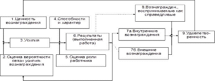 Пунктирная линия между результативностью и внешним вознаграждением означает, что может существовать связь между результативностью какого-либо сотрудника и выдаваемыми ему вознаграждениями. Дело в том, что эти вознаграждения отражают возможности вознаграждения, определяемые руководителем для данного сотрудника и организации в целом. Пунктирная линия между результативностью и вознаграждением, воспринимаемым как справедливое (8), использована для того, чтобы показать, что в соответствии с теорией справедливости, люди имеют собственную оценку степени справедливости вознаграждения, выдаваемого за те или иные результаты. Удовлетворение (9) — это результат внешних и внутренних вознаграждений с учетом их справедливости (8). Удовлетворение является мерилом того, насколько ценно вознаграждение на самом деле (1). Эта оценка будет влиять на восприятие человеком будущих ситуаций.