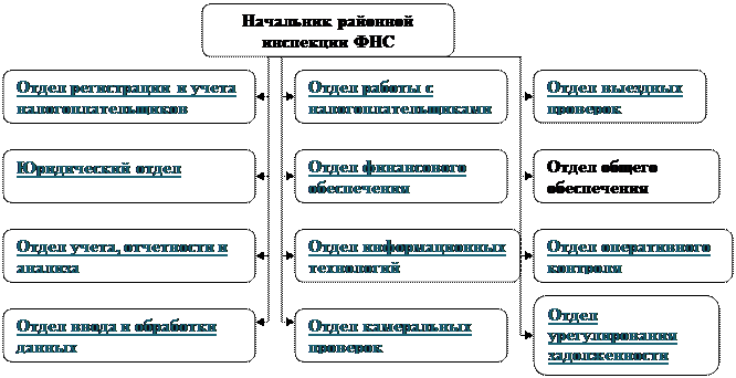 Рисунок 2.1 - Структура Управления Федеральной Налоговой Службы России по Республике Мордовия Законный представитель налогоплательщика при сдаче налоговой и бухгалтерской отчетности в налоговый орган осуществляет свои полномочия в соответствии со ст. 27 Налогового кодекса. Уполномоченный представитель налогоплательщика при сдаче налоговой и бухгалтерской отчетности в налоговый орган осуществляет свои полномочия в соответствии со статьей 29 Налогового кодекса. Прием налогоплательщиков рекомендуется осуществлять в специально выделенных для этих целей залах обслуживания налогоплательщиков, кабинетах (далее - операционных залах). Структура районной инспекции ФНС представлена на рисунке 2.2: