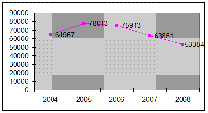 Рисунок 2– Количество проведенных камеральных проверок налоговыми органами РМ за 2004 - 2008 гг. Анализ финансово – хозяйственной деятельности налогоплательщика, соотнесение данных с критериями риска, информация из различных баз данных ФНС позволяют с высокой долей вероятности определить налоговые риски и круг налогоплательщиков для выездных проверок. Такой подход позволяет повысить качество проверок. Итоги рассматриваемого периода свидетельствуют о росте эффективности проверок (таблица 3) : Таблица 3 – Проверки налогоплательщиков по вопросам соблюдения законодательства о налогах и сборах в 2004 – 2008 гг.