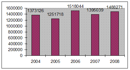 При оценке структуры просроченных платежей по акцизам, можно выделить ряд особенностей. Во-первых, за анализируемый нами период, она не была однородной, удельный вес задолженности по каждому из видов подакцизной продукции постоянно изменялся. Во-вторых, в 2006 г. в структуре просроченных платежей доминировали задолженности по спирту этиловому из всех видов сырья (в том числе этиловый спирт сырец из всех видов сырья) , и составил 49,22%, и по пиву – 47,3%. Что касается недоимки по алкогольной продукции с объемной долей спирта этилового свыше 25 %, то она составила 1,1%; алкогольная продукция с объемной долей спирта этилового до 9% включительно – 0,01% от общей суммы просроченных платежей по акцизам; задолженность по винам – 2,17%. В 2007 г. структура кардинально изменилась. Наибольший удельный вес заняли недоимки по алкогольной продукции с объемной долей спирта этилового свыше 25 % - 60,54% (по сравнению с 2006 г. увеличился на 13,24%, или на 67 062 руб.). Просроченные платежи по спирту этиловому из всех видов сырья (в том числе этиловый спирт сырец из всех видов сырья) составили 36,55% (сократились на 12,67%, или на 21 012 руб.). Удельный вес задолженности по винам сократился в 1,93 раза и составил 1,13% (хотя, фактически задолженность увеличилась на 5,4 тыс. рублей). Недоимка по пиву сократилась на 44 535 рублей, и составила всего 0,000543% в общей структуре задолженности. В 2008 г. задолженность по спирту этиловому из всех видов сырья (в том числе этиловый спирт сырец из всех видов сырья) составила 97,48%, что в 2,66 раза и на 34 962 руб. больше, чем за 2007 г. Недоимки по просроченным платежам за вино составили 2,25% от общей структуры задолженности, что на 1,13% и на 265 тыс. руб. превышает уровень 2007 г. В то время, как недоимок по алкогольной продукции с объемной долей спирта этилового свыше 25 % и по алкогольной продукции с объемной долей спирта этилового до 9% в 2008 г. не было. Рассмотрим динамику просроченных платежей по НДС за 2004 – 2008 гг., которая представлена на рисунке 7. Наибольшая недоимка по НДС наблюдалась в 2006 г. – 1 518,044 тыс. рублей, что составило 121 % от уровня 2005 г. Наименьшая задолженность – в 2005 г. – 1251,718 тыс. рублей, (91 % от 2004 г.) В 2008 г. задолженность удалось снизить на 101 451 руб., до 1,4328 тыс. рублей. Проанализируем структуру просроченных платежей. За анализируемый нами период 2006 – 2008 гг. значительных изменений не наблюдается. Наибольший удельный вес занимает задолженность по НДС – 35%, 35,53% и 38,52% соответственно за 2006, 2007 и 2008 гг. Увеличение просроченных платежей по НДС в 2007 г. составило 216,1 тыс. рублей.