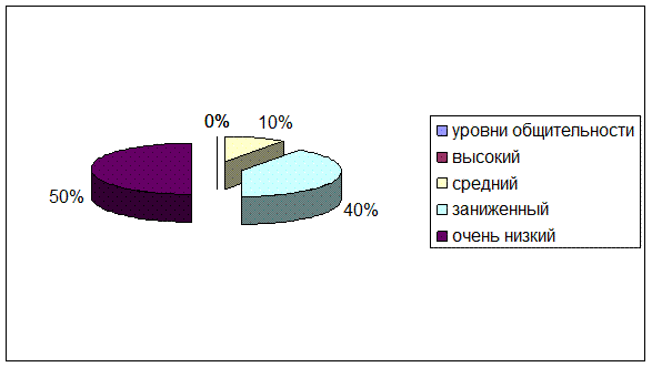 Рис. 2. Анализ результатов исследования уровня общительности по методике В. Ряховского Итак, по результатам данного исследования видно, что у воспитателей в основном наблюдается заниженный и низкий уровень общительности. Высокий уровень общительности не показал никто (0%), средний –1 человек, заниженный – 4 человека, очень низкий – 5 человек. Из данных диаграммы 1 видно, что средний уровень общительности воспитателей 10%, высокий уровень – 0%, заниженный – 40% и очень низкий – 50%. 2.3. Практические рекомендации Для повышения уровня развития общительности нами была разработана система занятий (Приложение 3) по формированию коммуникативных и умений педагогов и стилей общения . В основу программы легли работы А.С. Прутченкова и Ф. Бурнарда. Программа представляет собой разработки занятий на повышение уровня общения, коммуникативных и организаторских умений, стиля общения педагогов . Система занятий построена из расчета 10 занятий по 2 упражнения по 1,5- 2 часа в неделю по выходным. В группе – 10 человек. Одно занятие содержит упражнение на развитие общения и эмпатии и упражнение на развитие коммуникативных или организаторских умений. В заключение, проведя теоретические и практические исследования, необходимо сделать следующие выводы: Проблема человеческого общения и его места в развитии представлений человека о самом себе является одной из актуальнейших в ряду тех, над которыми работает психологическая наука. Концепции рассматривают общение как самостоятельную категорию, которая имеет свои внутренние закономерности развития и выступает как взаимодействие субъектов; как основа межличностных отношений и условие развития личности; как обмен информацией. Общение разворачивается в условиях наличия коммуникативной потребности, инициативности и активности субъекта. О бщение является сложным, многоуровневым и многофункциональным социальным явлением. С позиций современных концепция нами охарактеризованы три взаимосвязанные стороны общения: информационная (коммуникационная), интерактивная и перцептивная. В общении как в процессе последовательных действий, поведенческих актов (как вербальных, так и невербальных) происходит обмен информацией, ее интерпретация, взаимовосприятие, взаимопонимание, взаимооценка, сопереживание, формирование симпатий и антипатий, характера взаимоотношений, психологическое воздействие, разрешение противоречий, осуществление и регулирование совместной деятельности. В деловом общении людей объединяют интересы дела и совместная деятельность, направленная на достижение общих целей. Основной принцип деловых взаимоотношений – рациональность, поиск средств повышения эффективности сотрудничества. Коммуникативная деятельность, как и любая другая деятельность, характеризуется определенным стилем. В широком смысле слова стиль деятельности (например, управленческой, производственной, педагогической) — устойчивая система способов, приемов, проявляющаяся в разных условиях ее осуществления. Он обусловливается спецификой самой деятельности, индивидуально-психологическими особенностями ее субъекта. В собственно психологическом, узком смысле индивидуальный стиль - «это обусловленная типологическими особенностями устойчивая система способов, которая складывается у человека, стремящегося к наилу