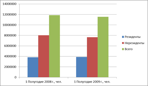 Таблица 3 - Число ночевок, проведенных в гостиницах и подобных учреждениях резидентами и нерезидентами Пропорционально количеству прибытий (отъездов) в первой половине 2009 года сокращалось и число ночевок туристов в гостиницах и подобных учреждениях, по сравнению с аналогичным периодом 2008 года. Данные по всем направлениям внутреннего и международного туризма принципиально не отличаются от данных таблицы 1. Сравнение количества ночевок, проведенных резидентами и нерезидентами, наглядно представлено на диаграмме 3.