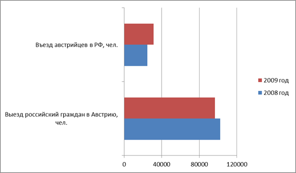 Диаграмма 2 – Число внутренних поездок на 100 жителей населения в 2009 г. по сравнению с 2008 г. В Австрии наиболее развит внутренний туризм (более 40 поездок по стране на 100 человек населения). Наряду с количеством прибытий (отъездов) в статистике туризма используется показатель, характеризующий продолжительность пребывания в стране, который измеряется в ночевках, проведенных в местах коллективного размещения туристов. Данные по количеству ночевок жителей страны и иностранных туристов в 1 полугодии 2009 года представлены в таблице 3.