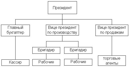 Рис.1. Пример линейной организационной структуры управления Преимущества линейной структуры управления: · четкая система взаимных связей функций и подразделений; · четкая система единоначалия - один руководитель сосредотачивает в своих руках руководство всей совокупностью процессов, имеющих общую цель; · ясно выраженная ответственность; · быстрая реакция исполнительных подразделений на прямые указания вышестоящих. · согласованность действий исполнителей; · оперативность в принятии решений; · простота организационных форм и четкость взаимосвязей; · минимальные издержки производства и минимальная себестоимость выпускаемой продукции; Недостатки линейной структуры управления: · Отсутствие звеньев, занимающихся вопросами стратегического планирования; · В работе руководителей практически всех уровней оперативные проблемы ("текучка") доминирует над стратегическими; · Перегрузка управленцев верхнего уровня; · Тенденция к волоките и перекладыванию ответственности при решении проблем, требующих участия нескольких подразделений; · Малая гибкость и приспособляемость к изменению ситуации; · Большое число "этажей управления" между работниками, выпускающими продукцию, и лицом, принимающим решение. [8] Вывод: Линейная структура управления проста, ее легко понять. Ясно очерченные права и обязанности всех ее участников создают условия для оперативного принятия решений, может широко использоваться и в современных условиях, но требует применения современных методов организации работы компании в целом. Для функциональной структуры управления характерно создание структурных подразделений, каждое из которых имеет свою четко определенную, конкретную задачу и обязанности. Следовательно, в условиях данной структуры каждый орган управления, а также исполнитель специализирован на выполнении отдельных видов управленческой деятельности (функций). Создается аппарат специалистов, отвечающих только за определенный участок работы. В основе функциональной структуры управления лежит принцип полного распорядительства: выполнение указаний функционального органа в пределах его компетенции обязательно для подразделений.