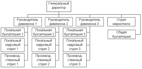 Рис.3. Линейно-функциональная структура управления В качестве преимуществ линейно-функциональных структур, как правило, отмечают: · стимулирование деловой и профессиональной специализации в условиях этой структуры управления; · высокую производственную реакцию компании, так как она построена на узкой специализации производства и узкой квалификации специалистов; · уменьшение дублирования усилий в функциональных областях. Несмотря на широкое распространение линейно-функциональных структур управления, существует целый перечень их недостатков: · размывание разработанной стратегии развития компании: подразделения могут быть заинтересованы в реализации своих локальных целей и задач в большей степени, чем всей компании в целом, то есть ставить свои собственные цели выше целей всей компании; · отсутствие тесных взаимосвязей и взаимодействия на горизонтальном уровне между подразделениями; · резкое увеличение объема работы руководителя компании и его заместителей из-за необходимости согласования действий разных функциональных служб; · чрезмерно развитая система взаимодействия по вертикали; · утрата гибкости во взаимоотношениях работников аппарата управления из-за применения формальных правил и процедур; · слабая инновационная и предпринимательская реакция компании с такой организационной структурой управления; · неадекватное реагирование на требования внешней среды; · затруднение и замедление передачи информации, что сказывается на скорости и своевременности принятия управленческих решений; цепь команд от руководителя к исполнителю становится слишком длинной, что затрудняет коммуникацию. Учитывая все вышеперечисленные недостатки, важно подчеркнуть, при каких условиях они сглаживаются: · линейно-функциональные структуры управления наиболее эффективны там, где аппарат управления выполняет рутинные, часто повторяющиеся и редко меняющиеся задачи и функции, то есть в компаниях, функционирующих в условиях решения стандартных управленческих проблем. · достоинства этих структур проявляются в управлении компаниями с массовым или крупносерийным типом производства, в компаниях, выпускающих относительно ограниченную номенклатуру продукции; · они наиболее эффективны при хозяйственном механизме затратного типа, когда производство наименее восприимчиво к прогрессу в области науки и техники; · линейно-функциональные структуры успешно применяются в компаниях, действующих в стабильных внешних условиях. [10] В настоящее время классические линейно-функциональные структуры присущи лишь мелким и части средних компаний. Они редко используются на уровне транснациональных корпораций, чаще – на уровне их подразделений за рубежом. Для крупных компаний доминирующим стал дивизиональный подход к построению организационных структур управления. 2.2. Дивизиональные (отделенческие) структурыДивизиональные (отделенческие) структуры управления являются наиболее совершенной разновидностью организационных структур иерархического типа и часто их считают средним типом между бюрократическими и адаптивными структурами управления. Впервые дивизиональные структуры управления появились в конце 20-х годов на предприятиях ''Дженерал Моторс'', а наибольшее распространение они получили в 60 –70-е годы ХХ века. В эти годы крупны