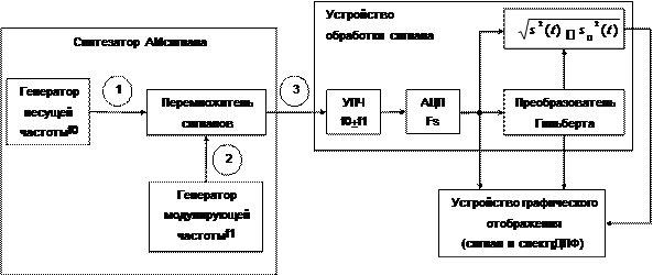 Данная схема состоит из трех компонентов: синтезатор АМ-сигнала, устройство обработки сигнала и устройство графического отображения. В нашем случае синтезатор АМ-сигнала необходим лишь только для генерации колебаний на заданной несущей частоте и со случайной амплитудой модулирующего колебания. Частота модулирующего колебания в каждом эксперименте так же задается случайно с небольшим интервалом разброса для разнообразия экспериментов.