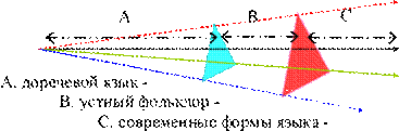 - графика (изобразительное искусство) - существительное - звук (музыка) - междометие, категория состояния - движение (танец) - глагол - речь - письменность, закрепление текстов График 1. Эволюция языка. Первая секция пирамиды графика – это доречевой период языка, вторая секция – период активной роли устного творчества как средства хранения и передачи информации, третья секция – период письменности как средства коммуникации, передачи и хранения информации. Условная нулевая точка принята за начало отчета. В процессе популяризации письма и упорядочения его правил и приемов была замечена разница между словами в их отношении к обозначаемым объектам, действиям и характеристикам. Эта разница признается “лексико-грамматической”, а сама классификация словарного запаса, по своей сути, является попыткой его систематизации на основании доречевого происхождения слов и по признакам их принадлежности к различным лексико-грамматическим классам, то есть, частям речи. Метод построен на соответствии трех основополагающих лингвистических категорий языковой грамматической конструкции - существительных, глаголов и междометий - трем основным видам искусства – графике (живописи), движению (танцу) и звукам (музыке) по их моторным и выразительным качествам. Так, древний человек, овладевая азами языка, не столько использовал природный речевой аппарат, сколько передавал информацию соплеменникам изображением реальных предметов или указанием на них (графикой), инсценированием движения (танцем) и звуковой эмоциональной окраской (музыкой), что позволяет утверждать, что этимологически такие виды фольклора как графика, музыка и танец восходят, соответственно, к увиденным им предметам и сценам, услышанным звукам окружающего мира и ощущаемому или видимому движению объектов. Подобные средства передачи информации по своей лингвистической сути могут быть определены и дифференцированы в соответствии со своей принадлежностью к одному из трех классов – существительным, глаголам или междометиям (категориям состояния). И если применить “механику” формирования символа (symbol formation) и утрату значения (lapse of meaning) к многомедийному, триадному словообразованию, то теория Вернера обретает законченную логику. Прежде всего, происходит описание объекта посредством движений, подражательной жестикуляции и/или использованием рисунка и вокальной, голосовой экспрессией. Так создается сложный многомедийный знак (или, если следовать логике Вернера, символ). Далее этот знак (или символ) подвергается известному фольклористам процессу нивелирования, утрачивая излишние элементы медий (“потеря значения”) и превращаясь преимущественно в голосовой знак, а в дальнейшем - в речевой, то есть, становится словом. Известно, что весь окружающий человека физический мир, все объекты и явления воспринимаются только на основе рецепторов, то есть, физиологически. Опираясь на данный объективный факт, предлагаемый общефилософский метод относит три лингвистические категории - существительные, глаголы, междометия - в их этимологическом соответствии графике, движению и звуку ко всей системе восприятия человеком окружающего мира, и рассматривает подобное соотношение как обусловленное природой и единственно физиологически возможное. Следуя данному положению, графикой являются все 
