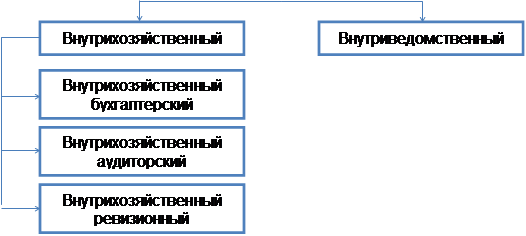 Рис. 1. Виды внутреннего финансово-экономического контроля Внутриведомственный контроль. Внутренний финансово-экономический контроль в министерствах, ведомствах, комитетах, других органах исполнительной власти осуществляется руководителями соответствующих образований и специально созданными в данных системах контрольно-ревизионными подразделениями, которые подчиняются, как правило, непосредственно руководителю министерства, ведомства, комитета, иного органа исполнительной власти. В Министерстве внутренних дел Российской Федерации, например, финансовый контроль осуществляется руководителями Министерства внутренних дел России, Главного управления внутренних дел и других подразделений непосредственно и через соответствующую финансовую службу. В системе Министерства внутренних дел России создана контрольно-ревизионная служба. Общее руководство контрольно-ревизионной работой в системе Министерства внутренних дел России осуществляет Контрольно-ревизионное управление Министерства внутренних дел России. Контрольно-ревизионный аппарат создан в качестве самостоятельного подразделения Министерства внутренних дел республик в составе Российской Федерации, Главного управления внутренних дел, Управления внутренних дел краев, областей, Москвы, Санкт-Петербурга и Ленинградской области и подчинен соответствующему руководителю Министерства внутренних дел, Главного управления внутренних дел, Управления внутренних дел. Контрольно-ревизионная служба системы органов внутренних дел проводит ревизии финансово-хозяйственной деятельности подразделений Министерства, состоящих на федеральном бюджете, не реже одного раза в два года. Внеплановые ревизии проводятся по указанию вышестоящих по отношению к ревизуемому подразделению руководителей, по решению судебно-следственных органов, при ликвидации подразделения, смене его руководителя или начальника финансовой службы. Срок ревизии не может превышать 40 дней. Продление этого срока допускается с разрешения руководителя, назначившего ревизию [3, с. 29]. Внутрихозяйственный контроль. У руководства предприятия есть выбор при организации контроля и ревизии на предприятии. Так, функции внутреннего финансово-экономического контроля может выполнять любой квалифицированный сотрудник, работающий на проверяемом предприятии (бухгалтерия, специальные службы внутреннего аудита, отдельные ревизоры). Также организация может привлекать для целей внутреннего аудита сторонние организации и (или) внешних аудиторов. От руководства организации зависят эффективность работы системы внутреннего контроля, его соответствие специфике деятельности предприятия. Следовательно, ответственность за работу системы внутреннего контроля возлагается на руководство предприятия. На предприятии применяют систему внутреннего контроля только в том случае, если затраты на функционирование системы меньше потерь, которые возникли бы при ее отсутствии. 2. Внутрихозяйственный бухгалтерский контроль Известно, что проведение ревизии и внешнего аудита предполагает определенные расходы. Эти расходы можно сократить, если внутрихозяйственный контроль будет осуществляться службой бухгалтерского учета. При проведении внутрихозяйственного контроля бухгалтерией организации выделяют три основн
