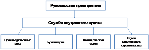 Рис. 4. Организация внутреннего аудита на предприятии Служба внутреннего аудита действует на основании законодательных и нормативных актов РФ, органов местного самоуправления, правил (стандартов) аудита. При проведении внутреннего аудита, кроме вышеперечисленных документов, она руководствуется учредительными документами, инструкциями, положениями, приказами и распоряжениями руководителя проверяемого предприятия. Руководитель службы внутреннего аудита разрабатывает план внутреннего аудита. Затем этот план утверждает руководитель предприятия. В соответствии с планом внутреннего аудита должны осуществляться все этапы проверки. Руководитель службы внутреннего аудита несет ответственность перед аудиторским комитетом и высшим руководством компании за организацию работы службы и выполнение поставленных задач. Служба внутреннего аудита имеет право: 1) проверять первичные документы, учетные регистры, планы, сметы и другие документы по финансово хозяйственной деятельности; 2) обследовать территорию предприятия (цеха, складские и служебные помещения, строящиеся объекты); 3) проводить инвентаризацию имущества и обязательств предприятия; 4) опечатывать места хранения документов и ценностей (сейфы, кассы, склады, архивы); 5) проверять, насколько верно отражены хозяйственные операция в бухгалтерском учете; 6) при необходимости представлять интересы предприятия в суде и арбитражном суде. Служба внутреннего аудита несет ответственность: 1) за своевременность представления руководству предприятия заключений о состоянии бухгалтерского учета и отчетности; 2) составление учредительных и внутрихозяйственных документов в соответствии с действующим законодательством; 3) предложения и рекомендации, данные аудитором в ходе проверки. На предприятиях, где работает служба внутреннего аудита, значительно выше уровень сохранности имущества, организации бухгалтерского учета и достоверности отчетности. Для эффективного функционирования системы внутрихозяйственного аудита необходимо соблюдение следующих требований: 1) наличие персонала с четко определенными правами и обязанностями; 2) разделение обязанностей на предприятии; 3) создание необходимых условий для работы службы внутреннего аудита (выделение помещения, специалистов, наличие нормативной и справочной базы данных и т. п.); 4) повышение квалификации сотрудников службы внутрихозяйственного аудита; 5) определение уровня оплаты труда работников службы внутреннего контроля. При организации работы службы внутреннего аудита используют следующие типовые формы документов: 1) набор основных вопросов для руководителей и работников бухгалтерии; 2) блок схемы и графики; 3) специально разработанные тесты; 4) специальные бланки и проверочные листы; 5) перечни замечаний, протоколы или акты. Служба внутреннего аудита организации самостоятельно разрабатывает методики, порядок изучения и оценки финансово экономической системы. По результатам такого изучения и оценки финансово экономической системы планируют процедуры проверки. В ходе аудиторской проверки могут быть выявлены серьезные недостатки системы внутреннего контроля. Эти недостатки так же, как и рекомендации по их устранению, следует отражать в письменном отчете аудитора руководству проверяемого экономического субъекта. П