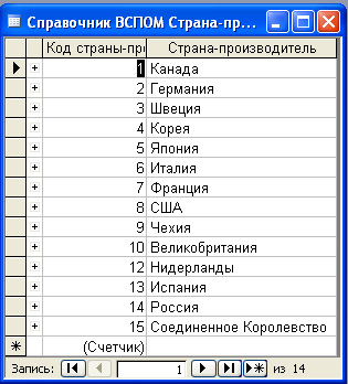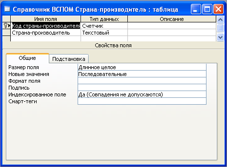 Рисунок 6 Справочник ВСПОМ Страна-производитель в режиме конструктора Схема базы данных