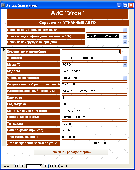Рисунок 17 Форма Справочник владельцы Форма Автомобили в угоне Форма позволяет вводить или просматривать информацию об автомобилях, числящихся в угоне. При этом в форме предусмотрена возможность проверки авто или по регистрационному знаку, или по идентификационному номеру, или по номеру кузова (прицепа). На рис.18 приведен вид формы с отбором по идентификационном знаку.