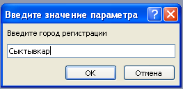 Рисунок 21 Окно ввода параметров для формы Отбор по городу регистрации При этом форма будет имеет вид, приведенный на рис.22. Форма организована как ленточная, в отличие от простых форм в предыдущих примерах. Это связано с тем, что каждому знаку госрегистрации, VIN или номеру кузова соответствует только один автомобиль, а по каждому городу может быть несколько автомобилей.