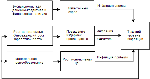 Кейнсианская позиция, концентрирующаяся вокруг проблемы совокупных расходов, как главного фактора определяющего национальное производство и занятость, берет за основу кривую Филипса (жесткая зависимость между инфляцией и безработицей). Эта модель, как отмечалось выше, показывает, что в экономике может возникнуть либо инфляция, либо безработица, но одновременно они появиться не могут. Однако, руководствуясь событиями 70-80х в США и настоящими, протекающими в России, когда наблюдался параллельный рост цен и уровень безработицы, мы можем поставить под сомнение правильность кейнсианских выводов. Назрела объективная причина для пересмотра теории, и кейнсианцы объяснили эти процессы серией шоков предложения, или ценовых шоков, сдвинувших кривую Филипса вправо вверх. Несмотря на такую доработку, приведшую теорию в соответствие с фактами, одновременный рост инфляции и безработицы в течение нескольких лет экономического подъема 1983-1988 годов заставил многих задуматься о существовании между инфляцией и безработицей явной обратной связи. Монетаристская теория инфляции В монетаристской литературе проблема инфляции тоже занимает одно из центральных мест. Здесь причинная зависимость между изменением количества денег и уровня цен рассматривается как основная экономическая закономерность. В общем виде монетаристская концепция инфляции может быть представлена так: [7] Рис. 3 Монетаристская модель инфляции