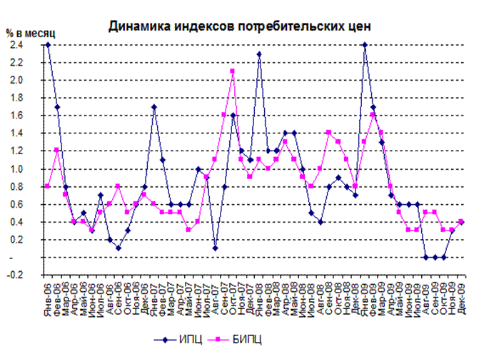 Среди всех продовольственных товаров в наименьшей степени подорожали базовые продукты питания. Стоимость минимального набора продуктов питания увеличилась за год всего на 0,7 % (в 2008 году прирост цен составил 17,5 %). Таблица 2 ИПЦ и индексы цен по группам, %