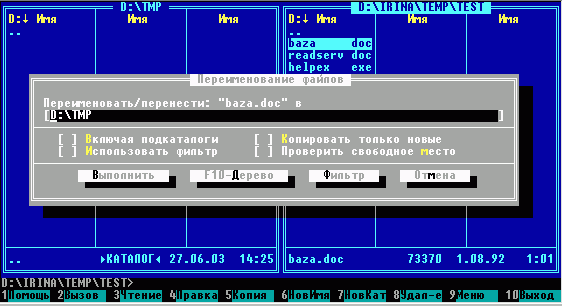 Обычно среду, куда будет происходить копирование, устанавливают заранее. Например, если надо начать заполнение файлами нового каталога, созданного выше (MY_DIR), нужно войти в этот каталог, а затем переключиться клавишей [Tab] на панель со средой, откуда будет копироваться файл. Затем надо нажать [F5] и [Enter]. Если надо скопировать файл в текущем каталоге, то после нажатия [F5] следует набрать в диалоговом окне имя файла-копии (не совпадающее с исходным) и нажать [Enter]. Файл будет скопирован с другим именем в том же каталоге. В копировании может быть отказано, если на диске недостаточно места для размещения файла. В таком случае придется отказаться от операции или освободить место, удалив один или несколько ненужных файлов.