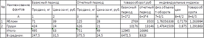 ). Поскольку базисный уровень индексируемого показателя приравнивается к 1 или 100%, то разность между полученным индексом и 1 или 100% характерзиует относительную величину изменения количества проданного товара. По этому индексу можно определить и абсолютное изменение количества проданного товара в натуральном выражении как разность между числителем и знаменателем индекса Произведем расчет индивидуальных индексов физического объема товарооборота. По яблокам: По грушам: Индивидуальный индекс цен ндивидуальный индекс цен