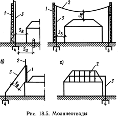 ) и заземлителя ,ля зоны типа А го==(1,1—0,002/1м)Ам, ,ля зоны типа Б Го==1,5/1м. В тросовом молниеотводе (рис. 18.5, б) в качестве молниеприемника используется горизонтальный трос, который закрепляется на двух опорах. Токоотводы присоединяются к обоим концам троса, прокладываются по опорам и присоединяются каждый к отдельному заземлителю. При установке молниеотвода на здании должно быть обеспечено безопасное расстояние Sв по воздуху между токоотводом и защищаемым объектом, исключающее возможность электроразряда между ними (рис. 18.5, в). Кроме того, для предупреждения заноса высоких потенциалов через грунт должно быть обеспечено безопасное расстояние Sз между заземлителем и металлокоммуникациями , входящими в здание (см. рис. 18.5, а); оно определяется по формуле Sз==0,5 Rи и должно быть не менее 3 м; Rн — импульсное электросопротивление заземлителя. Импульсное электросопротивление заземлителя для каждого токоотвода на объектах I категории защиты должно быть не более 10 Ом. Типовые конструкции заземлителей, удовлетворяющие этому требованию, приведены в инструкции СН 305—77. Для защиты от ударов молнии объектов II категории применяют отдельно стоящие или установленные на защищаемом объекте не изолированные от него стержневые и тросовые молниеотводы. Допускается использование в качестве молниеприемника металлической кровли здания или молниеприемной сетки (из проволоки диаметром 6...8 мм и ячейками 6Х6 м), накладываемой на неметаллическую кровлю (рис. 18.5, г). В качестве токоотводов рекомендуется использовать металлические конструкции зданий и сооружений, вплоть до пожарных лестниц на зданиях. Импульсное сопротивление каждого заземлителя должно быть не более 10 Ом, для наружных установок — не более 50 Ом. Защита объектов III категории от прямых ударов молнии организуется так же, как для объектов II категории, но требования к заземлителям ниже: импульсное электросопротивление каждого заземлителя не должно превышать 20 Ом, а при защите дымовых труб, водонапорных и силосных башен, пожарных вышек—50 Ом. |