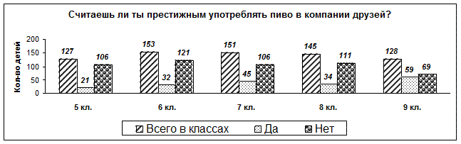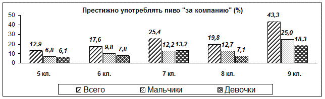 Многие подростки употребляют пиво «за компанию», считая это модным, престижным. Употребляя пиво с друзьями, подростки чувствуют себя взрослыми, самостоятельными, это придает им уверенности в себе. Кроме того, большую роль здесь играет реклама, которая подразумевает, что хорошо отдыхать с друзьями можно только с пивом. По данным анкетирования 7 и 9-е классы опережают по числовым показателям учащихся остальных классов (Рис 3). В среднем из всех подростков 27,1 % считают престижным употреблять пиво «за компанию», из них самый большой % среди 9-х классов – 43,3 % (Рис. 4).