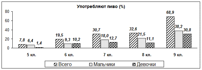 Мы выяснили, что уже в возрасте 11-12 лет (5 класс) дети начинают пробовать пиво. В 6, 7, 8– х классах их число возрастает и достигает своего максимума в 9-х классах (Рис. 5). В среднем 36,4 % детей употребляют пиво, из них на долю 9-х классов приходится 68,9 %, причем достоверной разницы между мальчиками и девочками нет (Рис. 6). Большинство подростков знает, что употребление пива наносит вред здоровью (Рис. 7). Однако 22,4 % так не считает. Из них так же наибольший % составляют учащиеся 9-х классов (33,3%) (Рис. 8)