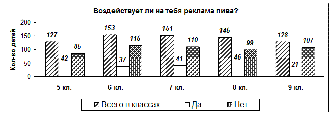Рис. 8 На вопрос: «Воздействует ли на тебя реклама пива?» большинство подростков ответили отрицательно. Однако при проведении анкетирования именно этот вопрос требовал больше всего разъяснений. Анализ данных показал, что количество положительных ответов среди 5, 6, 7, 8-х классов были примерно одинаковыми, тогда как в 9-х классах заметно ниже (Рис. 9). Всего по всем классам в среднем 26,7 % подвержены воздействию рекламы пива. Из них больше всего (от 19,8 до 23,6 %)-это учащиеся 5-8 классов (Рис. 10). Работая над темой, мы научились работать с текстами книг, подбирать нужную информацию. Изучили проблему своего поколения и узнали мнение современной молодежи о ней. На основании полученных результатов мы можем сделать следующие выводы :