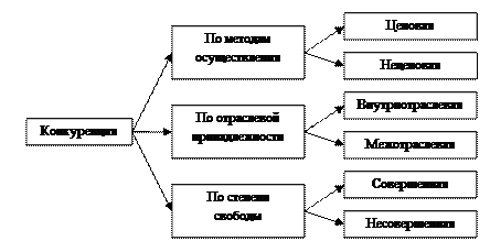 Глава 2. Конкуренция, её сущность и значение. Виды конкуренции. 2.1. Понятие конкуренции, её роль в экономик е.Рыночной конкуренцией называется борьба за ограниченный спрос потребителя, ведущаяся между фирмами на доступных им сегментах рынка. Конкуренция представляет собой конкретный механизм, с помощью которого рыночная экономика решает фундаментальные вопросы: что, как и для кого производить? Сущность конкуренции проявляется, прежде всего, в ее следующих функциях, которые выделяются в экономической литературе: · обеспечение нацеленности производителя на запросы потребителя; · стимулирование роста эффективности производства; · дифференциация товаропроизводителей; · давление на производство, распределение ресурсов между отраслями народного хозяйства в соответствии со спросом и нормой прибыли; · ликвидация неконкурентоспособных предприятий, их продажа, слияние или поглощение другими, более сильными, предприятиями, преобразование; · стимулирование снижения цен и повышения качества товаров.[5] 2.2 Положительные и отрицательные стороны конкуренции.Конкуренция имеет большое значение в экономической жизни общества. Она способствует развитию производства и повышению его эффективности. Благодаря конкуренции создаются огромное разнообразие товаров и услуг и богатые возможности выбора для потребителей. Конкуренция создает условия по оптимальному использованию достижений научно-технического прогресса в области изготовления новых видов товаров, вызывает необходимость гибко реагировать на изменения в производстве и реализации товаров, нацеливает производителей на повышение качества товаров, обеспечивает свободу выбора и действий продавцов и покупателей. Конкуренция стимулирует деятельность субъектов рыночных отношений. Через конкуренцию товаропроизводители как бы контролируют друг друга. Их борьба за потребителя приводит к снижению цен, уменьшению издержек производства, улучшению качества продукции, усилению научно-технического прогресса. Конкуренция имеет и негативные стороны. Она обостряет противоречия экономических интересов, чрезвычайно усиливает экономическую дифференциацию в обществе, обусловливает рост непроизводительных издержек, побуждает создание монополий. Конкуренция отрицательно сказывается на защите окружающей среды, не стимулирует развитие производства товаров и услуг коллективного пользования (дороги, общественный транспорт), сохранение невоспроизводимых ресурсов (лес, дикие животные, полезные ископаемые). С конкуренцией связываются также такие явления, как ухудшение материального положения определенной части населения, безработица, социальная несправедливость. Противоборство агентов рынка усиливает их социально-экономическое расслоение. В целом современные экономисты считают конкуренцию одной из главных причин эффективности производства. Именно конкуренция заставляет фирмы внедрять научно-технические достижения, совершенствовать технологию производства. 2.3 Типы и формы конкуренции.Таблица 1 Типы конкуренции.