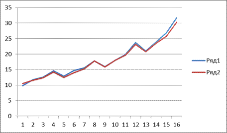 Темпы роста были примерно одинаковые. Это говорит о том, что для определения прогнозного значения можно использовать средний темп роста: