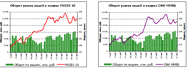 Рис.3 Оборот рынка акций и индексы ММВБ. В январе ярко выраженного лидера роста среди “голубых фишек” на рынке наблюдалось. Больше всех выросли бумаги нефтяных компаний: “ЮКОС” - на 21,49%, “Сибнефть” - на 21,31%, “Лукойл” - на 18,45. Хотя в конце месяца и наметилась положительная динамика цен на мировых нефтяных рынках, рост акций нефтяных компаний выглядит довольно странно на фоне суммарного месячного падения цены на “черное золото”. Также заметного прогресса добились акции ОАО “Ростелеком”, подорожавшие на 17,80%, и акции Сберегательного банка РФ, подорожавшие на 16,78% Доля фондового рынка ММВБ в общем рыночном обороте России в январе составила 86%. Структура оборота российского рынка акций в январе 2007 года