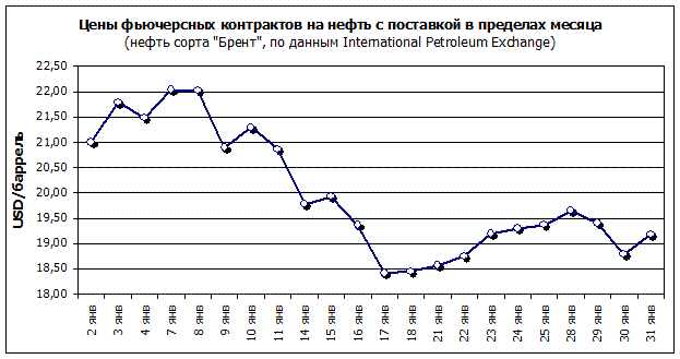 Рис.5. Цены фьючерских контрактов на нефть с поставкой в пределах месяца. Исходя, из технических параметров можно заключить, что в январе прекратилась тенденция роста. “Быки”, попытавшиеся снова повернуть рынок к росту 22 – 23 января, были остановлены “медведями”. Большой объем торгов указывает на ожесточенную борьбу “быков” с “медведями”. В результате этой борьбы в конце месяца рынок несколько раз достиг уровня своей поддержки (для СФИ ММВБ – 255 пунктов, для ММВБ 10 – 458 пунктов), что может свидетельствовать о скором развороте рынка и начале падения цен. По всей видимости, рынок акций в дальнейшем ожидает снижение цен. Как только индексы ММВБ опустятся за уровень своей поддержки, на рынке начнется спад. На сколько это спад будет ощутимым, зависит от внешних факторов, таких как стоимость нефти на мировых рынках и состояние американского рынка. 2.3 .Направления совершенствования работы коммерческих банков на рынке ценных бумагРоссийский рынок ценных бумаг продолжает оставаться противоречивым, потому что на фондовой бирже действуют старые финансовые инструменты (кредиты, ваучеры, акции) и несмотря на определенное движение вперед рынок не обеспечивает финансирование экономики, т.к. идет продажа и перепродажа, игра на курсовой разнице. Кроме того инфляция продолжает обесценивать рынок в целом и сдерживать его развитие, в связи с чем рынок не отражает состояние экономики. И еще такой ситуации способствует то, что развитию рынка мешают кризис платежей и разрыв хозяйственных связей, и что делает проблематичным вложения в ценные бумаги как отечественного, так и иностранного капитала. К основным проблемам российского рынка ценных бумаг относится: · развитие инфраструктуры фондового рынка - возрождение фондовых бирж и создание организованных внебиржевых систем торговли, создание расчетно-клиринговых систем; · повышение информационной открытости рынка, увеличение его прозрачности; · создание полной законодательной и другой нормативной базы функционирования, т.к. без законодательного регулирования рынок ценных бумаг не может выполнять своего основного назначения: быть источником средств для преодоления инвестиционного кризиса. Важные положения закона - установление единых требований при осуществлении профессиональной деятельности для кредитных организаций и других инвестиционных компаний; · проблема мелкого инвестора. Рынок государственных ценных бумаг самых ликвидных и надежных на сегодняшний день закрыт для мелких и средних инвесторов, что так же создает проблемы для самого рынка, для мотивации деятельности банка на этом рынке, что порождает финансовые проблемы более широкого характера. С одной стороны не используются имеющиеся накопления населения, с другой - бюджет не получает возможных источников покрытия. Таким образом, на рынке возникают перекосы, поскольку он ориентирован на крупные промышленные финансовые структуры. · нехватка капиталовложений, так инвестиционный потенциал банков в 7-8 раз меньше, чем необходимо, а в бюджете денег нет, и довольно-таки трудно привлечь иностранный капитал, поскольку для нашего рынка характерен краткосрочный характер; и главная причина - нестабильность как в экономической, так и в политической ситуации страны; · дальнейшая интеграция с фондовыми рынками развитых стран, х