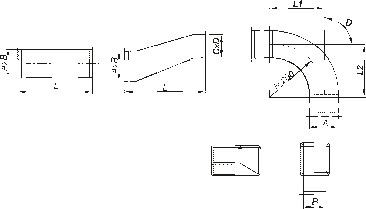 Условные обозначения: А - ширина, мм В - высота, мм С - ширина, мм D - высота, мм L - длина, мм Е - смещение по стороне А, мм F - смещение по стороне В, мм. Возможно любое соотношение А, В, С, D, L, E, F с учетом технологических ограничений. Переходы с круглого сечения на прямоугольное.