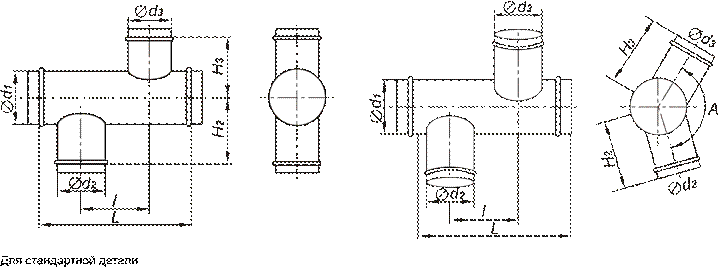 Н1 = Н2 = 0,5d1 + 50 мм Если l > (d1 + d2) / 2 + 120, то рассмотрите возможность использования двух тройников Условные обозначения: d1 - диаметр концевой, мм d2 - диаметр, мм d3 - диаметр, мм L - длина детали, мм I - расстояние между врезками, мм. Если l = 0, не указывать А - угол между врезками Возможно любое соотношение, d1 , d2 , d3 , L, I, H1 и H2 с учетом технологических ограничений. Утка.