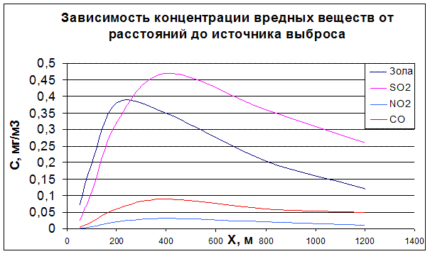 4. На основании полученных значений сi , строят графики зависимости концентраций вредных веществ от расстояний до источника выброса, откладывая в масштабе по оси ординат значения ci (мг/м3 ), а по оси абсцисс - расстояния Х(м).