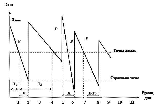 Рисунок 1 Система контроля за состоянием запасов с фиксированной периодичностью заказа Условные обозначения: Т – интервал времени, через который повторяется заказ ( в нашем случае – 3 дня) – для данной системы величина постоянная; t – время, необходимое на размещение и выполнение заказа (в приведенном примере – 1 день); Р1 , Р2 , …, Рi – величина отдельного, i-го заказа; З макс – предусмотренный нормой максимальный запас; З ф – фактический запас на момент проверки; З t – запас, расходуемый за время t, необходимое для размещения и выполнение заказа; А – период времени с интенсивным спросом; В – период времени с нулевым запасом. Интенсивность спроса, характеризуемая углом наклона участков линии, описывающей изменение запасов, в этой модели является величиной переменной (угол наклона различных участков ломаной - неодинаков). А поскольку заказ осуществляется через равные промежутки времени, то величина заказываемой партии в разных периодах также будет различна. Естественно, применять эту систему можно тогда, когда есть возможность заказывать партии, различные по величине (например, в случае применения контейнерной доставки заказываемого товара эта система не применима). Кроме того, систему не применяют, если доставка или размещение заказа обходится дорого. Например, если спрос за прошедший период был не значителен, то заказ также будет незначителен, что допустимо лишь при условии не существенности расходов, связанных с выполнением заказа. Особенностью описываемой системы является также и то, что она допускает возникновение дефицита. Как видно из графика, если спрос резко усилится (то есть график круто уйдет вниз - участок А), то запас закончится до наступления срока подачи заказа. Это означает, что система применима, когда возможные потери от дефицита для предприятия также несущественны. Подводя итог, отметим, что система контроля с фиксированной периодичность заказа применяется в следующих случаях: - условия поставки позволяют получать заказы различными по величине партиями; - расходы по размещению заказа и доставке сравнительно невелики; - потери от возможного дефицита сравнительно невелики. На практике по данной системе можно заказывать один из многих товаров, закупаемых у одного и того же поставщика, товары, на которые уровень спроса относительно постоянен, малоценные товары и т.д. В системе контроля за состоянием запасов с фиксированным размером заказа размер заказа на пополнение запаса является величиной постоянной. Интервалы времени, через которые производится размещение заказа, в этом случае могут быть разными как представлено на рисунке 2.