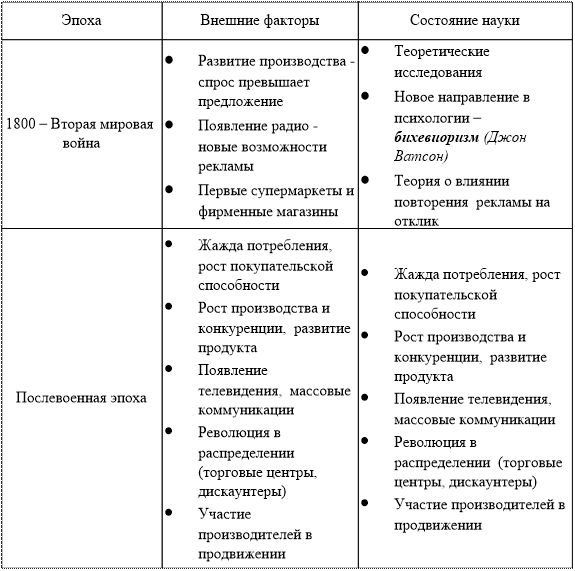 2.1. Состояние науки о поведении потребителей до второй мировой войны. В начале двадцатых годов самой большой проблемой было производство, а не сбыт. Ситуация начала изменяться по мере усиления конкуренции. Продавцы товаров (производители и торговцы) стали понимать, что сохранить преимущества в конкурентной борьбе оказывается все сложнее. Именно тогда маркетинг начал заставлять предпринимателей задумываться о том, что хочет покупатель. Попутно начали возникать вопросы (которые маркетологи пытаются решать поныне) о наиболее эффективных методах воздействия на покупателя. В тот период мало изучали прикладное направление психологии и других наук о поведении, хотя отдельные маркетинговые исследования на эту тему появились именно тогда. Итак, ниже представлены факторы, повлиявшие на формирование системы маркетинга в довоенное время. 1. Для большинства отраслей промышленности спрос на потребительские товары превышал предложение (за исключением периода «великой депрессии») и самую большую проблему составляло производство. 2. С развитием радио росли коммуникационные возможности рекламы, которая стала передаваться на большие расстояния. 3. Каналы распределения были невелики и локальны, хотя в начале 1930- х гг. уже появились супермаркеты и фирменные магазины. 4. Продавец не встречал препятствий, убеждая дистрибьюторов продавать изделия, особенно там, где потребление стимулировалось рекламой. Таким образом, о состоянии науки о поведении потребителей на данный период можно сказать, что научные исследования в этой области были, скорее, теоретическими, нежели практическими, и начинают развиваться к концу этого периода. 2.2. Состояние науки о поведении потребителей в послевоенное время. Возможности производства значительно опережают спрос, и у продавцов (производителей и торговцев) не оказалось иного выбора, как принять концепцию маркетинга. Одновременно все большее значение начинают приобретать различные науки о поведении. В частности, во второй половине пятидесятых годов родилось новое направление поведение потребителей. Предпосылками его зарождения были существенные перемены в экономической жизни общества. После войны отмечался экономический подъем, вызванный жаждой потребления у утомленных войной народов. Однако рост производства и с ним рост конкуренции вскоре привели к ситуации превышения предложения над спросом, что и вынудило принять концепцию маркетинга. Телевидение выступило в роли «великого продавца». Эра массовых коммуникаций набрала полные обороты. Телевидение присоединилось к другим средствам массовой информации и за короткий срок стало одним из самых действенных средств продвижения товара на рынке. Распределение претерпело поистине революционные изменения с появлением торговых центров и магазинов, торгующих по сниженным ценам. Впервые потенциальные покупатели получили возможность пользоваться такими удобствами и комфортом при приобретении товаров повседневного спроса. Производители получили возможность использовать рекламу и СМИ для продвижения нового товара по каналам распределения. Дистрибьюторам пришлось снизить свои аппетиты и принять условия игры, которую начали диктовать производители товаров (до этого производитель обычно был озабочен лишь собственно производством, оставляя тор