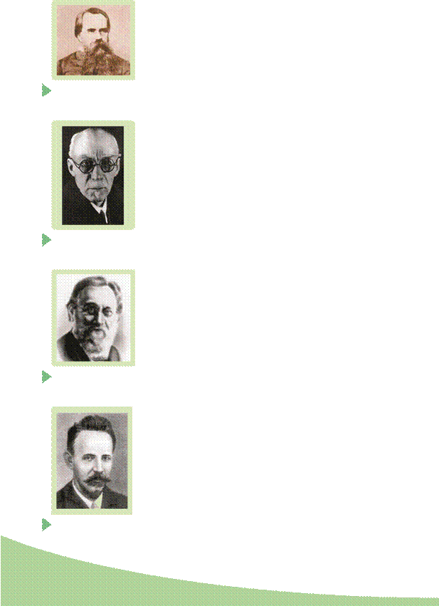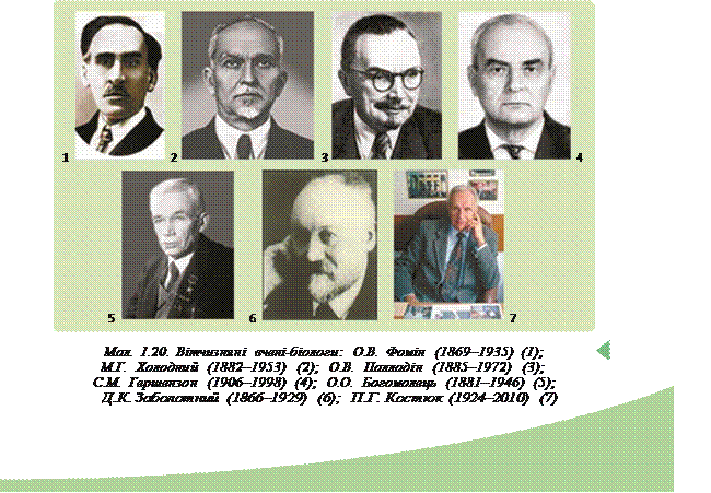 (1845–1916) Важливий внесок у розвиток біології належить українським ученим. Зокрема, дослідження Олександра Онуфрійовича Ковалевського (мал. 1.15) та Івана Івановича Шмальгаузена (мал. 1.16) відіграли важливу роль у розвитку порівняльної анатомії тварин, філогенії та еволюційних поглядів. Ілля Ілліч Мечников (мал. 1.17) відкрив явище фагоцитозу і розвинув теорію клітинного імунітету, за що йому було присудж ено Нобелівську премію з фізіології та мед ицини в 1908 році. Він також запропонував гіпотезу походження багатоклітинних тварин. О.О. Ковалевського та І.І. Мечникова справедливо вважають засновниками еволюційної ембріології. Всесвітню славу українській бо танічній Мал. 1.18. школі приніс Сергій Гаврилович Навашин (мал. 1.18), який С.Г. Навашин 1898 ро ку відкрив процес подвійного запліднення у квітко(1857–1930) вих р ослин.