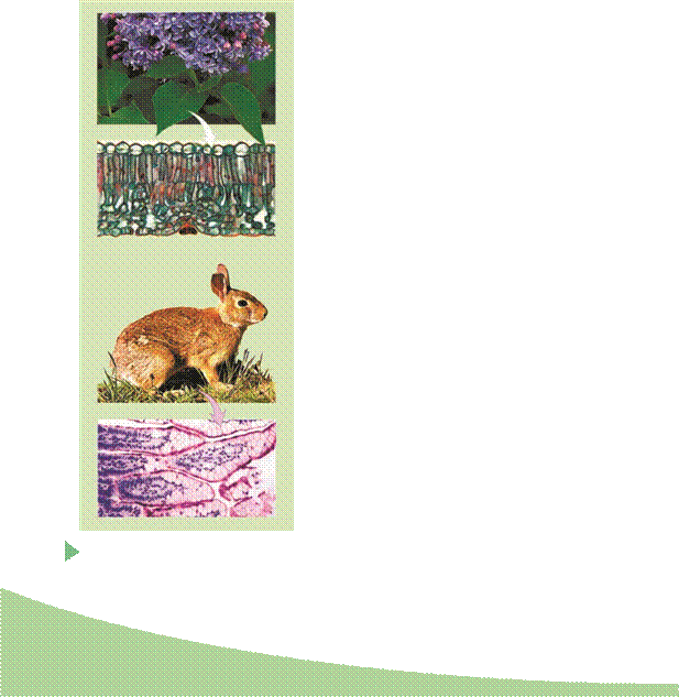 Властивості живої матерії. Хоча біологія досліджує різні прояви життя протягом багатьох сторіч, навіть на сучасному етапі її розвитку важко дати чітке й стисле визначення поняття «життя». Тому перелічимо основні властивості, притаманні живій матерії. Більшість з них вам відомі з попередніх курсів біології. 1 2 Мал. 2.1. Рослина та клітинна будова листка (1); тварина та клітинна будова її тканини (2) Кожна жива істота, або організм, складається з окремих часток – к літин (мал. 2.1). Неживі предмети (за винятком р ешток організмів) к літинної будови не мають. Таким чином, клітина – це структурнофункціональна одиниця організації живих організмів . Неклітинні форми життя – в іруси – здатні виявляти прояви життєдіяльності лише всередині клітин тих організмів, в яких вони паразитують.