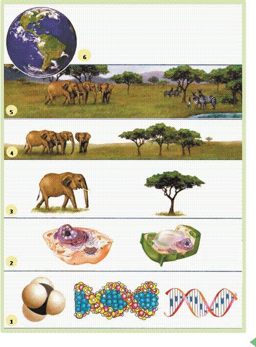 Мал. 2.4. Рівні організації живої матерії: 1 – молекулярний (відбуваються біохімічні реакції, кодується спадкова інформація); 2 – клітинний (клітини складаються з молекул); 3 – організмовий (багатоклітинні організми складаються з клітин); 4 – популяційно-видовий (види складаються з популяцій, а популяції – з окремих особин одного виду); 5 – екосистемний, або біогеоценотичний (складається з різних видів); 6 – біосферний (біосфера – сукупність усіх екосистем планети)