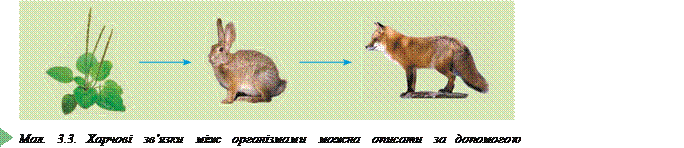 ма тематичної моделі. (Розв’яжіть задачу. Зайцю, для того щоб збільшити масу на 5 кг, треба з’їсти 50 кг рослин. Лисиця, якщо з’їсть зайця масою 5 кг, збільшить свою масу лише на 500 г. Визначте, яка частина їжі засвоюється, а яка – втрачається) зв’язків у еко системі, опису ючи зв’язки між окремими видами: рослина – рослиноїдний вид, рослиноїдний вид – хижак і т. д. (мал. 3.3). Математичне моделювання в біології – сук упність математичних методів аналізу складних кількісних взаємозв’язків і закономірностей у б іологічних системах. Його здійснюють за допомогою комп’ютерної техніки, яка дає змогу зберігати величезні обсяги даних і швидко їх обробляти за д опомогою спеціальних програм. Математичне м оделювання дає змогу спостерігати за можливими варіантами перебігу подій, виділяти окремі зв’язки, комбінувати їх тощо. Передумовою створення правильної математичної моделі слугують накопичення даних спостережень або експериментів про певні явища чи процеси.